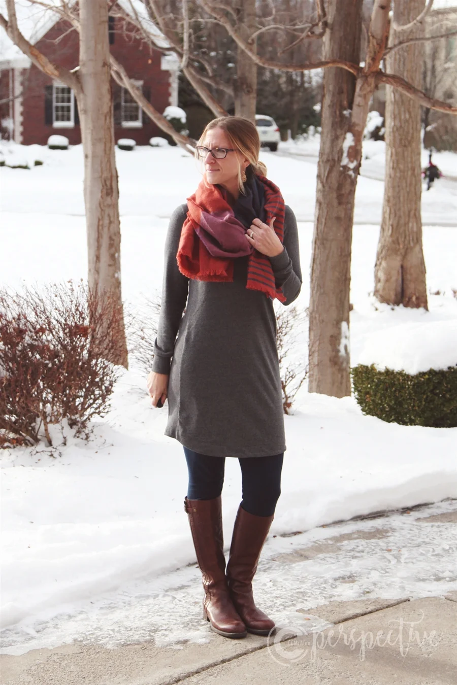 I wore it with this gray sweatshirt dress, some teal leggings and my riding boots.